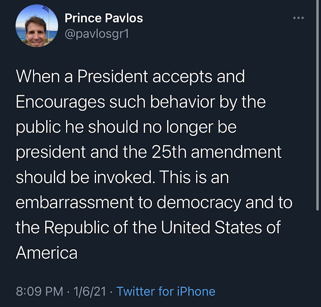 As a result, on Wednesday evening, Crown Prince Pavlos of Greece issued a statement on Twitter calling for the 25th Amendment of the United States Constitution to be invoked. The crown prince is well-versed in the consequences of successful coups in democratic countries, as it was one such insurrection that cost Pavlos’ father, King Constantine II, his throne and the continuation of the Greek constitutional monarchy. The message of the Crown Prince of Greece is as follows: “When a President accepts and Encourages such behaviour by the public he should no longer be president and the 25th amendment should be invoked. This is an embarrassment to democracy and to the Republic of the United States of America.