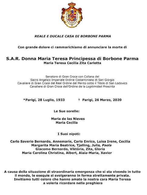 Prince Sixte Henri of Bourbon-Parma has announced that today, Thursday, 26 March 2020, his sister Princess Marie-Thérèse of Bourbon-Parma passed away in Paris from the coronavirus. The princess was eighty-six years-old.