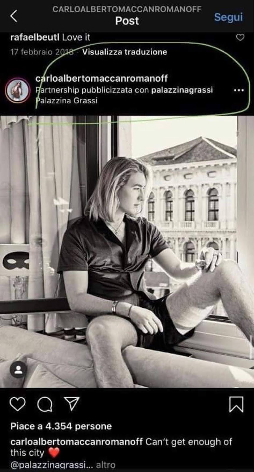 | Screenshot from Mr. Maccan’s Instagram exhibiting a paid promotion he received from Palazzina Grassi. |