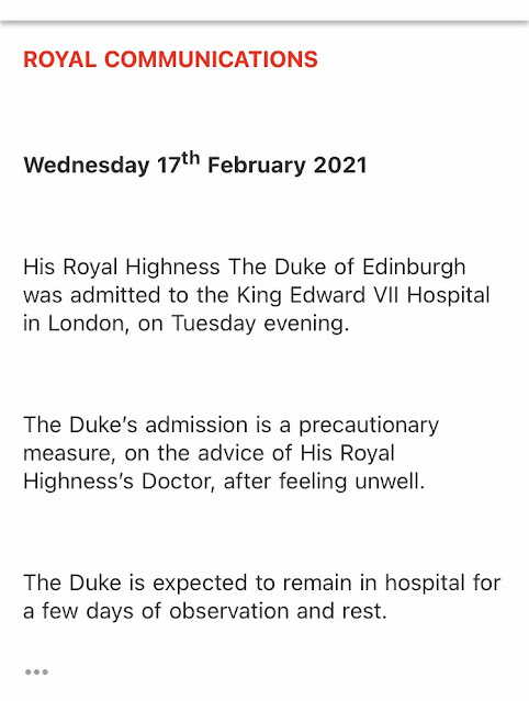 HRH Prince Philip, Duke of Edinburgh, was admitted to King Edward VII Hospital in London yesterday evening. Born on 10 June 1921, the duke is ninety-nine years-old. The Duke of Edinburgh is expected to remain in hospital for a number of days.