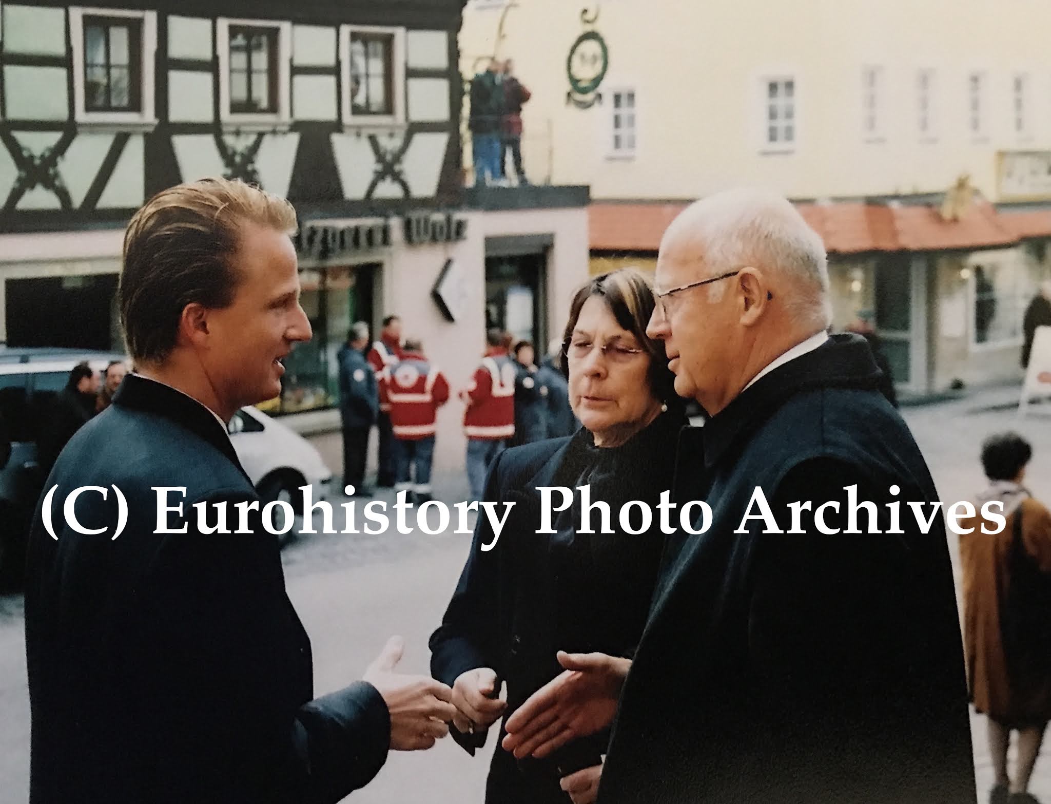 Princess Mechtilde zu Leiningen and her husband Karl-Anton Bauscher speak with Hereditary Prince Kraft zu Hohenlohe-Oehringen at the funeral of Fürst Kraft zu Hohenlohe-Langenburg, 2004.