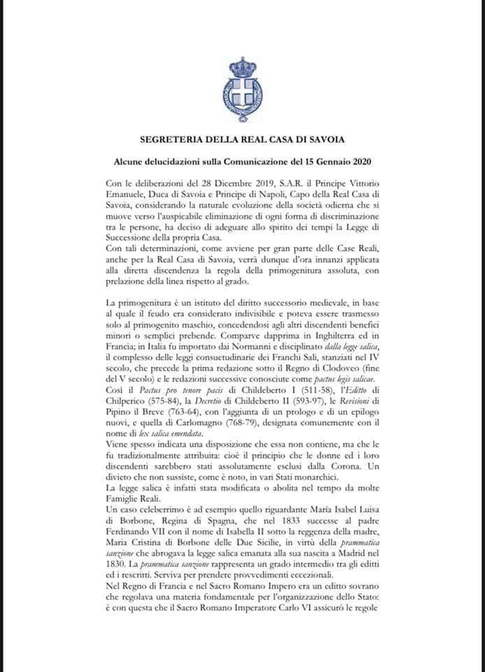 The Prince of Naples states that his decision has effect immediately. It is noted that the Princesses Vittoria and Luisa will accompany their father the Prince of Venice to a service on 14 March 2020 at Hautecombe Abbey to commemorate King Umberto II and Queen Marie-José.