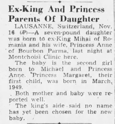 | The birth of Princess Helen of Romania as announced in the press (1950) |