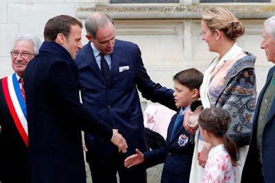 | As the Count and Countess of Paris look on, Prince Gaston shakes hands with Emmanuel Macron |