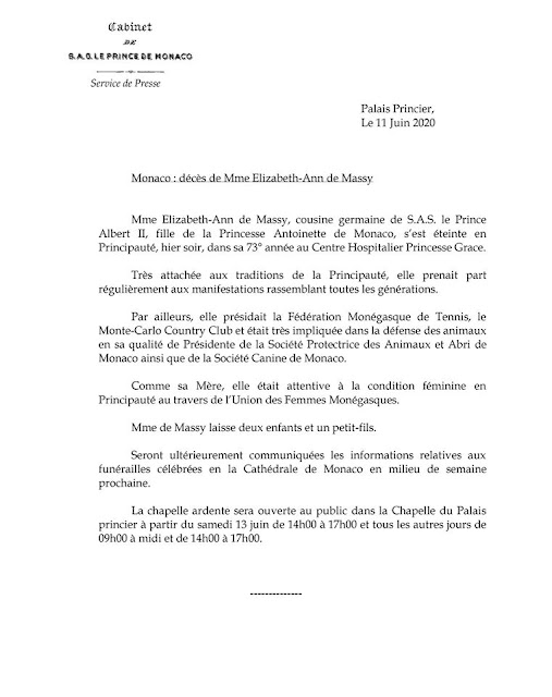 Yesterday, 11 June, the Prince’s Palace of Monaco announced the death of Elisabeth-Anne de Massy, who passed away on Wednesday, 10 June, at the Princess Grace Hospital Centre in Monte Carlo. She was seventy-two years-old.